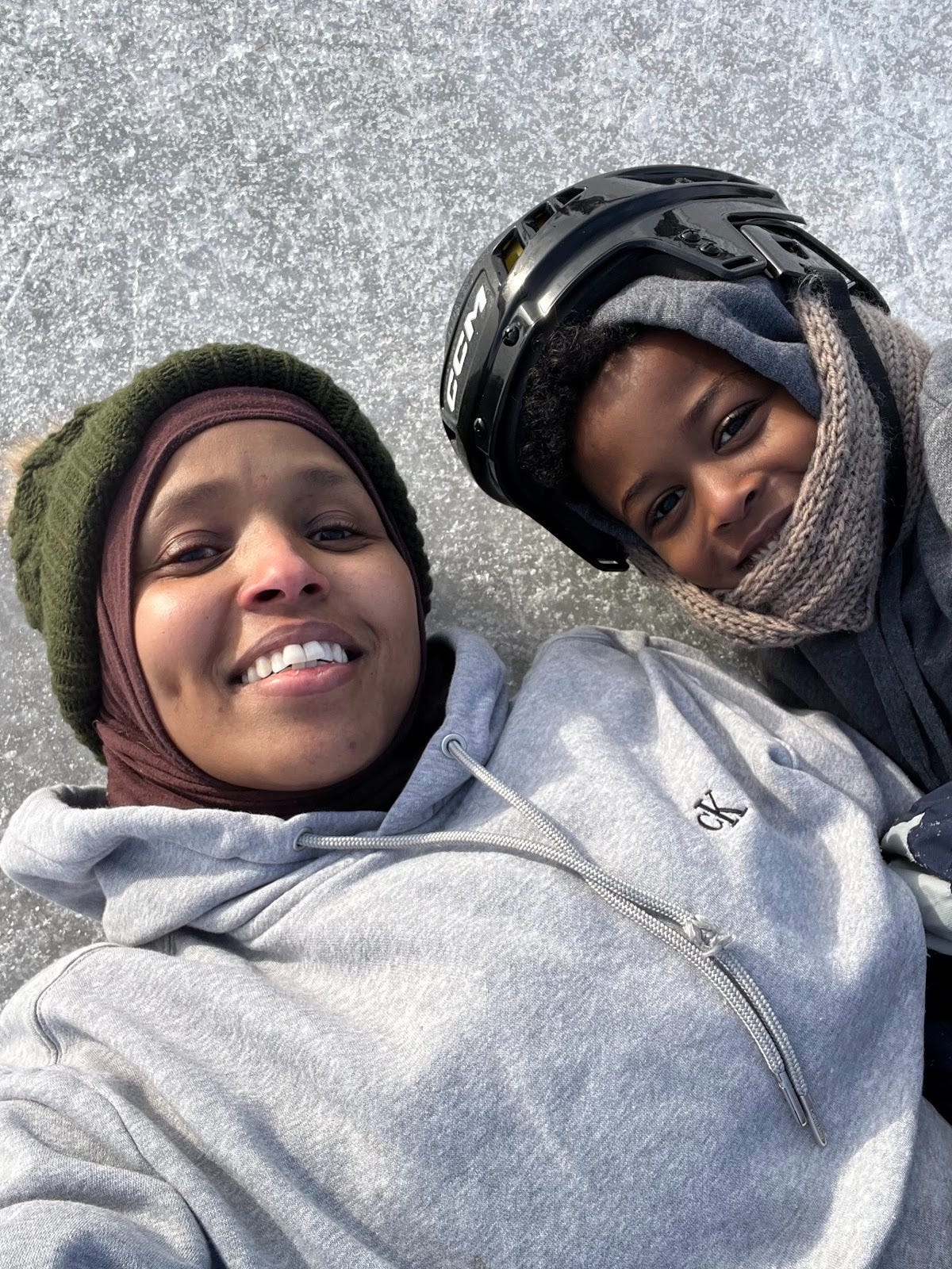 My plan was really not to skate because I had not done it for a long time and I really don’t know how to skate that much. Also, I was only going there to take him. But he didn’t know that. And he had been asking me to take him skating since the snow fell to the ground. I would say yes, we would go skating, but never really put a time or a date on it. Ibrahim said, “Oh please, please, Hooyo. Put on your skates.”